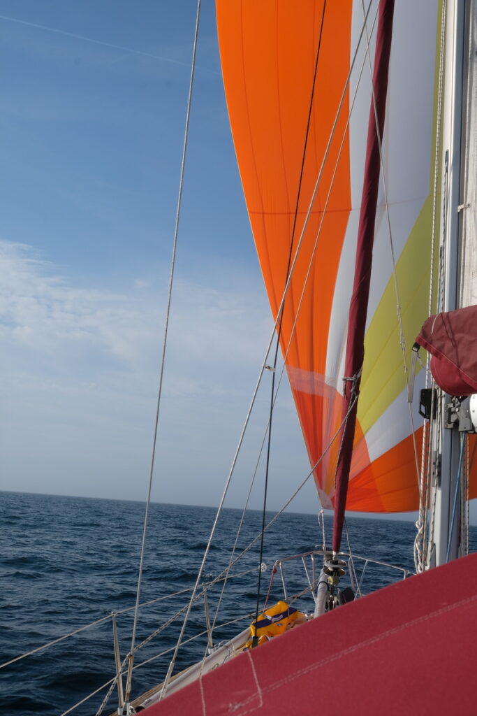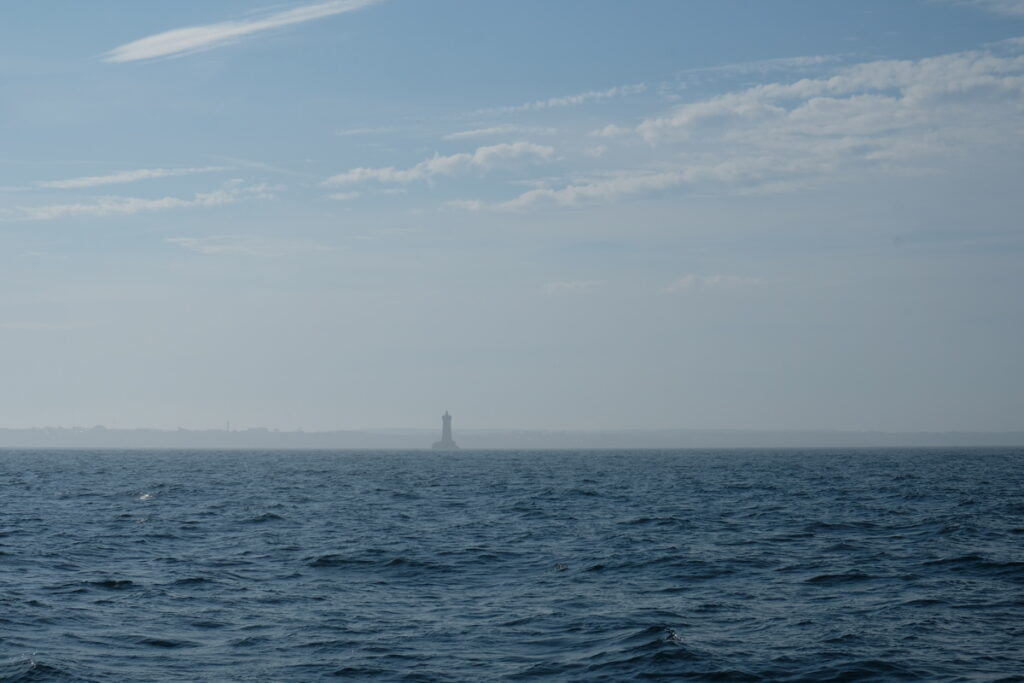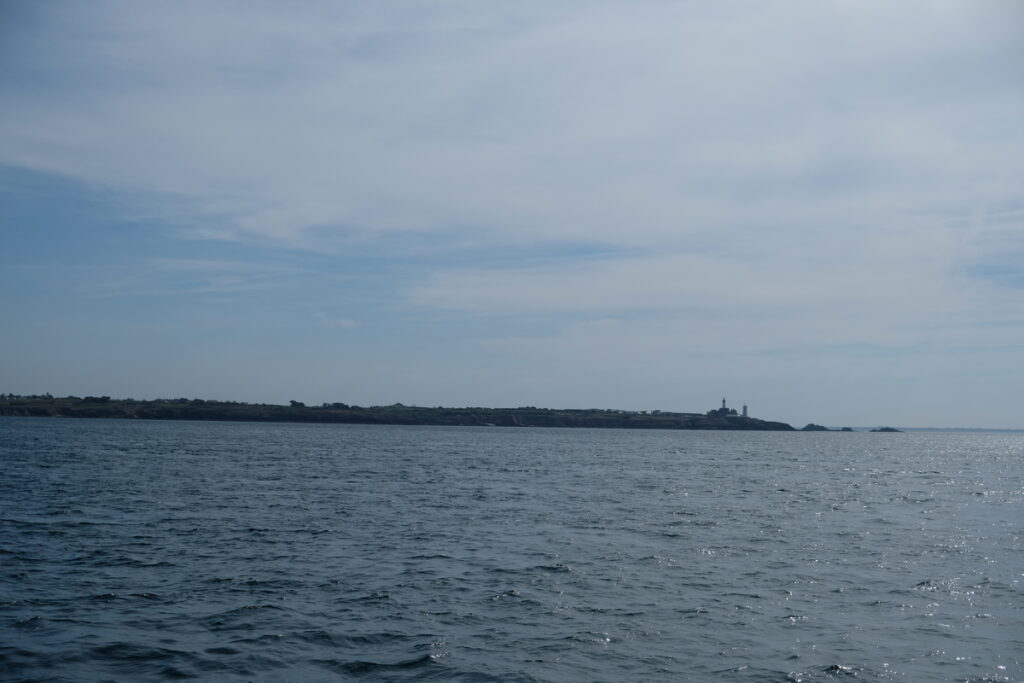 Nous prenons un petit-déjeuner, préparons le bateau et larguons les amarres un peu après 7h30 comme prévu. Plusieurs bateaux quittent aussi le port à cette heure. Le courant est le même pour tout le monde… A la sortie l’Aber Wrac’h, le vent est orienté au secteur nord-est et trop faible que pour naviguer vent arrière. Les bateaux qui nous accompagnent prennent tous la route directe en faisant usage du moteur. Il est trop tôt pour que je me résigne à cette solution. Nous envoyons le spi et tirons un bord vers le large. La direction du bateau plus près du vent crée en effet un peu de vent apparent et nous permet de naviguer à la voile mais pas tout à fait dans la bonne direction ! Après environs une heure, nous empannons et le vent semble tout juste suffisant pour nous permettre de nous engager dans le chenal du Four sous spi. Je suis soulagé, l’option que nous avons choisie semble viable. La descente du chenal ne pose pas de difficulté particulière. Il suffit de respecter les bouées qui le délimitent. Le temps est à nouveau radieux et nous apprécions la beauté de la côte ainsi que le passage de la pointe Saint-Mathieu.