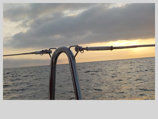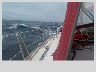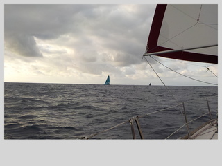 Le temps est ensoleillé et Lady Mi avale les miles avec un facilité déconcertante. Nous gardons un contact VHF avec Tarumba toutes les deux à trois heures pour partager nos impressions et le plan de la route. La seconde nuit arrive finalement assez vite. Nous gardons la même formule pour les quarts. Le vent est un peu plus capricieux en fin de nuit et nous dévions lentement mais sûrement à l’ouest de la route. Nous empannons donc pour faire route quasi directe vers Gijon. Nous passons la matinée du deuxième jour à chercher un peu le vent. Nous essayons une nouvelle configuration de voiles: grand voile haute, génois tangonné au vent et trinquette sous le vent. C’est la première foi que Lady Mi porte trois voiles simultanément. Il faut être honnête, ça a fait beaucoup de manœuvres pour un gain de vitesse assez marginal.