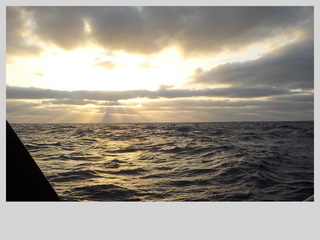 L’analyse faite par l’équipage de Tarumba est similaire. Un départ synchrone est donc une évidence qu’il ne nous est même pas nécessaire de verbaliser. Les bateaux sont prêts vers 18h00 et nous quittons ensemble Port-la-Forêt avec un vent encore faible qui nous oblige à faire quelques heures de moteur. Comme prévu, le vent s’établit en fin de soirée. Nous envoyons le génois tangonné au vent et éteignons le moteur. La vitesse se stabilise rapidement autour de six noeuds. Nous subissons une houle de travers d’un gros mètre mais la navigation n’est pas inconfortable. Les quarts de nuit s’organisent. Nous optons pour deux fois trois heures et puis deux fois deux heures.