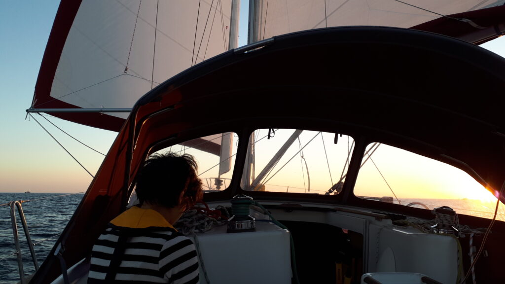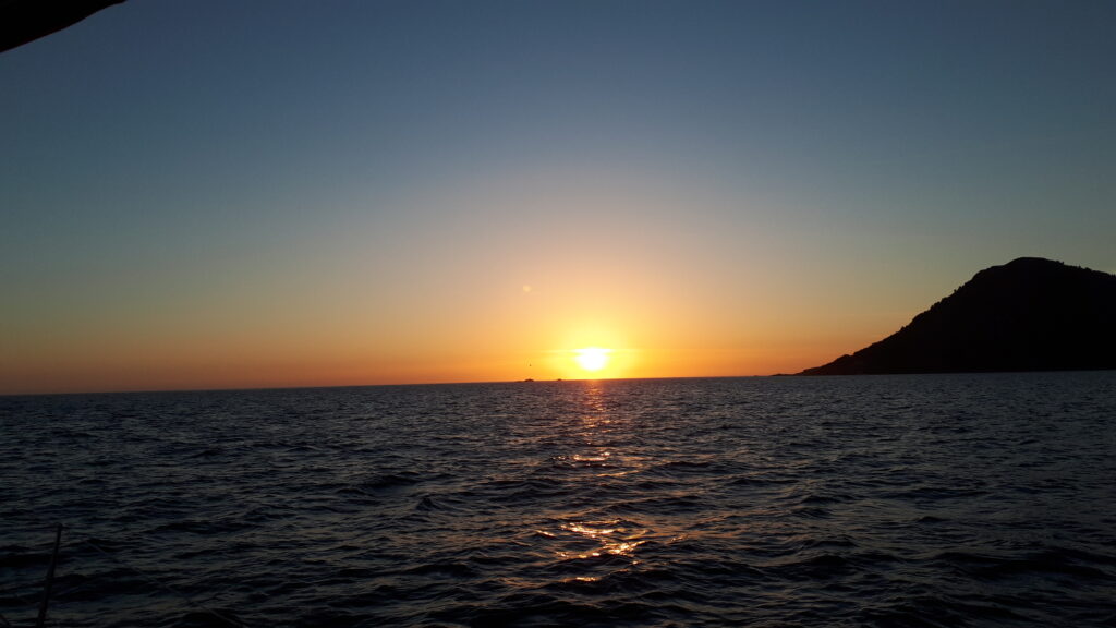 Nous laissons partir les équipages de Tarumba et Picasso en balade alors que nous préparons le bateau. Les ammarres sont larguées le mardi 11 Octobre vers 19h30 et Lady Mi prend la direction du Portugal. Le coucher de soleil sur l’eau est magnifique mais nos petits cœurs sont un peu lourds car non seulement nous quittons les copains, mais ce départ signifie aussi la fin de notre séjour en Espagne continentale. C’est ça aussi le voyage…