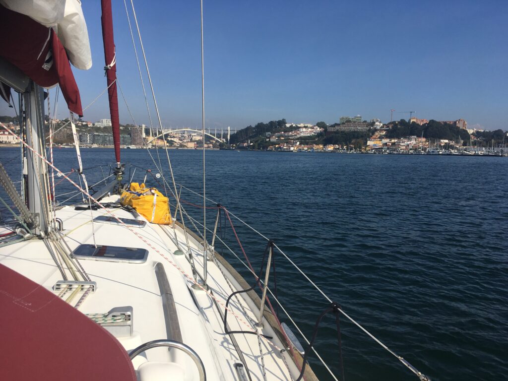 Pour nous, le cap Finisterre est à la fois un cap physique et symbolique. Nous avons franchi les 3 mois de voyage. Je me souviens des conseils que je donne moi-même aux autres (et que j’écoute rarement pour moi-même). Ayant passé 3 années professionnelles hors de ma ville natale, j’ai plusieurs fois dû donner des conférences sur ces années, et je suis sollicitée par les collègues qui rêvent de voyager. Après les « trucs et astuces » habituels qui permettent de s’intégrer et gagner sa vie à l’étranger, je termine souvent par : « …mais les 3 premiers mois ne comptent pas ». Parce que les 3 premiers mois sont durs, rudes, semés d’embûches, qui en valent tellement la peine, qui sont très vite oubliés tellement l’expérience globale est enrichissante. Cette règle s’applique à une expatriation, à un nouveau boulot, à la parentalité, à un déménagement, à la rénovation d’une maison. Elle s’applique encore à notre voyage. Nous devenons plus sereins, plus sûrs, plus complices. Nous accueillons le mal de mer comme un nouvel équipier à bord, qui mérite respect et considération. Nous faisons confiance à notre rythme et à notre intuition. Le cap des 3 mois est franchi. Nous profitons une dernière fois des rias espagnoles avant d’en faire le deuil : non, nous ne connaîtrons pas la Galice de fond en comble (il faudrait au moins 3 vies pour cela). Nous prenons la direction du Portugal dès que la météo nous le permet. Même si les températures sont clémentes en journées, elles chutent la nuit. Le froid est encore accentué par le vent glacial en navigation (ce vent du Nord qui nous pousse vers le Sud est aussi celui qui nous force à enfiler une combinaison de ski, la nuit, sous nos vestes de quart). En 24 heures de navigation, nous passons des vêtements de ski au short et sandales. Nous accostons avec bonheur à Porto, pleine de contrastes et de souvenirs.