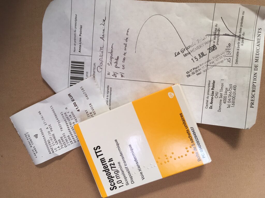 Le traitement pharmacologique du mal de mer date du 19e siècle, et depuis lors le nombre de molécules disponibles n’a cessé d’augmenter. Les guerres mondiales du 20e siècle ont accéléré le développement de ces molécules, pour permettre aux marins et aux pilotes de meilleures performances sur l’ennemi.22 Les traitements de la cinétose ont alors été étudiés de manière très rigoureuse. De nos jours, et avec des objectifs pacifiques, l’objectif n’est pas de se doper ni de se droguer, mais de ne pas se priver d’un traitement qui a fait ses preuves. Il est imprudent de laisser le navire dirigé par un équipage malade, et la pharmacologie peut nous aider. Lorsque j’ai constitué notre pharmacie de bord, j’ai peut-être été trop exhaustive, en m’inspirant des listes publiées dans la littérature.23 Par contre, il existe des médicaments essentiels, qu’on emporte rarement en trop : ceux qui concernent les maladies chronique (si un/des membre(s) de l’équipage ont souffert dans le passé d’une maladie chronique, une rechute est probable) et ceux qui concernent le mal de mer. Les classes médicamenteuses les plus répandues contre le mal de mer sont les anti-histaminiques et les anti-cholinergiques. La combinaison de plusieurs classes médicamenteuses permet d’accroître leur efficacité en diminuant les effets secondaires. Prendre son traitement (quel qu’il soit) dès la veille du départ et à intervalle régulier permet d’en augmenter l’efficacité (notion pharmacocinétique : pour qu’un médicament soit efficace, il faut que son taux sanguin soit suffisant et stable ; en langage courant : tant qu’à prendre un médicament, autant qu’il fonctionne). Lorsqu’un traitement est nécessaire, nous tentons donc de l’initier au moins 12 heures avant le départ prévu, ce qui peut être difficile en cas de météo changeante et de départ impromptu (bref, on fait ce qu’on peut).