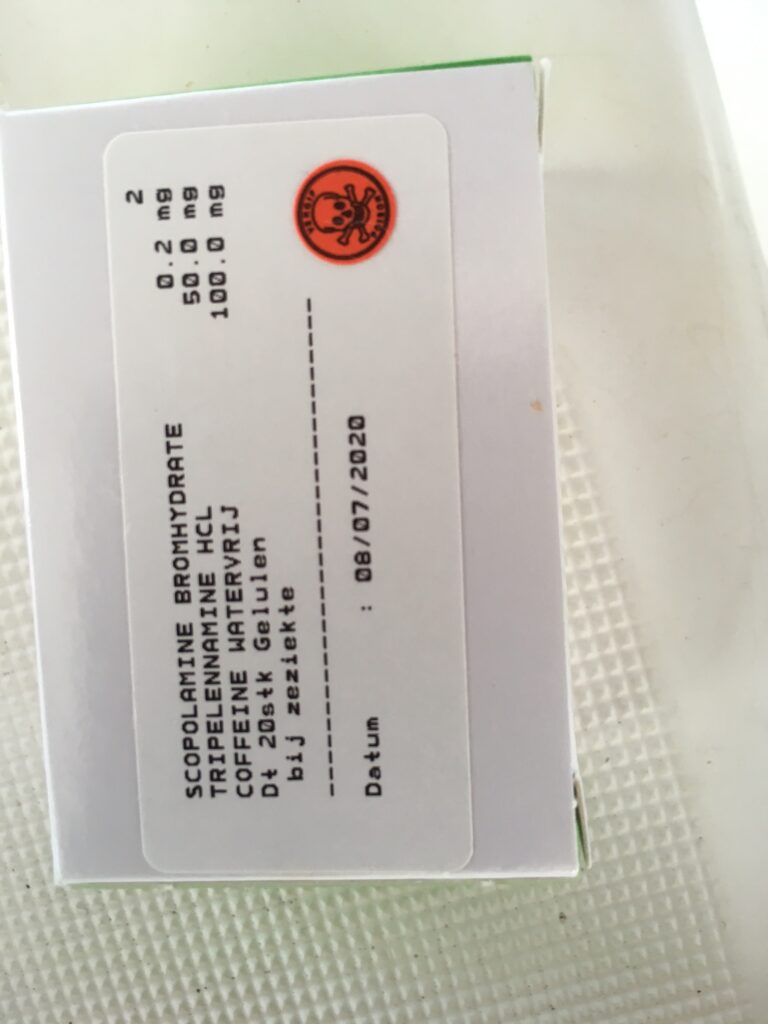 Les anticholinergiques, dont le plus connu est la scopolamine, sont les médicaments les plus anciens. Ils agissent au niveau des efférences vestibulaires vers le noyau vestibulaire et possiblement au niveau des intégrations centrales (antagoniste de récepteurs cholinergiques).24 Les effets secondaires sont donc communs à tous les médicaments anti-cholinergiques : sédation, sécheresse buccale, vertige, trouble visuel. Globalement, ces effets sont légers, bien tolérés et inférieurs au bénéfice. Ils ont les mêmes contr’indications que tous les médicaments anti-cholinergiques.25 La scopolamine est disponible selon différentes formulations (orale, transdermique, spray nasaux).24 En Belgique, il faut soit faire importer des patchs transdermiques de France (toutes les pharmacies belges le font), soit se procurer les patchs en France (les pharmacies françaises reconnaissent les prescriptions médicales belges), soit faire faire à son pharmacien une préparation magistrale orale contenant 0.2mg de scopolamine (1 à 3 gélules par jour). La scopolamine étant une spécialité chère et fournie uniquement en grand conditionnement, la plupart des pharmaciens seront réticents à la préparation magistrale (qui les oblige à acheter une large quantité pour en vendre quelques grammes). Une pharmacie côtière pourra plus facilement écouler son stock de scopolamine. Dans le cas contraire, une discussion honnête et compréhensive avec son pharmacien peut aider. Dans le budget du bateau, il est possible que le prix de la scopolamine semble dérisoire par rapport à son bénéfice, et nous pouvons toujours proposer à notre pharmacien de nous facturer son stock. L’avantage de la forme orale est sa modularité. L’avantage de la voie transdermique est que le médicament ne se vomit pas. Le patch transdermique s’applique 12h avant le départ pour une durée d’action de 3 jours (idéale pour les traversées). Nous n’avons pas d’expérience de la scopolamine en spray nasal, mais ce dernier pourrait combiner l’avantage de la modularité et d’éviter la voie digestive. Il est disponible en Allemagne à la dose de 0.4mg.26