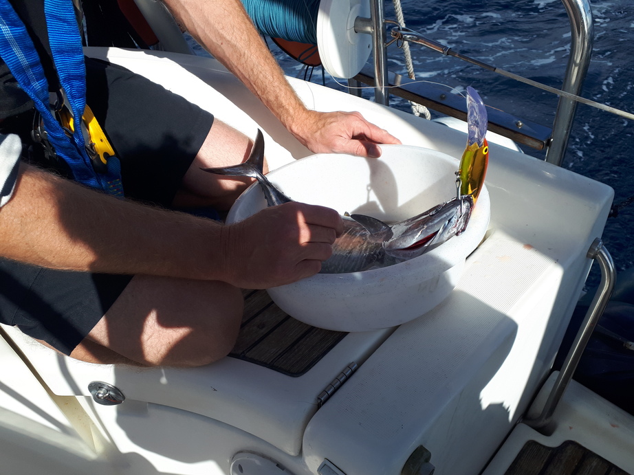 Le cinquième jour de mer est celui au cours duquel nous devrions apercevoir les côtes de la Graciosa. Nous sommes euphoriques dès le réveil. Je remets une ligne de pêche à l’eau. Nous prenons un petit déjeuner et puis devons empanner pour ajuster la route. Anne-Lise qui travaille dans le cockpit alors que je suis à la plage avant entend le bruit de la ligne de pêche qui se déroute à toute vitesse. Nous terminons la manœuvre avant de remonter la ligne qui nous offre la surprise d’une bonite d’environ 3kg. C’est le premier poisson du voyage… Je passe donc la matinée à conditionner le poisson et puis à le préparer pour le repas de midi. Nous mangerons la suite durant les prochains jours. Nous faisons également notre premier pain.