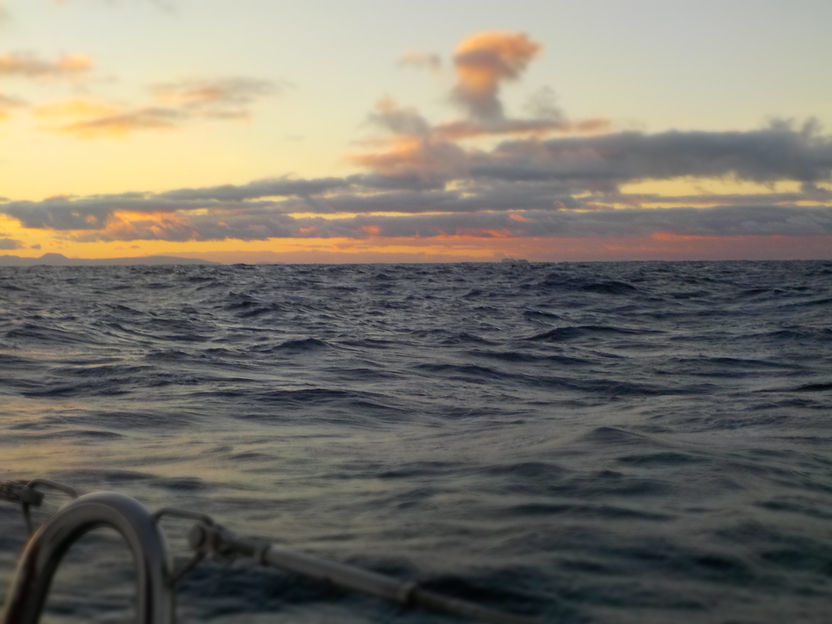 Parmi les choses qui nous frappent, il y a la vitesse à laquelle la nuit tombe. La lumière du jour s’estompe rapidement entre 17h30 et 18h00, laissant place à un magnifique ciel étoilé que nous avons beaucoup de plaisir à admirer. Les étoiles filantes n’y sont pas rares. Je commence la quatrième nuit de quart alors que le vent monte sensiblement. Lady Mi se comporte bien mais je ne suis pas serein. Un cargo apparaît à l’horizon et deux relèvements successifs m’indiquent que nous sommes en route de collisions. Je n’ai pas trop envie de manœuvrer le bateau car c’est difficile avec le génois tangonné. Il faut savoir que, selon la réglementation internationale pour la prévention des abordages en mer, un navire qui navigue sous voile a « priorité » sur un cargo. Néanmoins, lorsque cela est possible, nous essayons de modifier notre route pour ne pas gêner ces monstres des mers qui sont difficiles à manœuvrer. Dans le cas présent, je contacte le cargo par radio pour discuter d’une modalité de croisement sûre. L’officier de quart me répond avec bienveillance et incline immédiatement sa route. Je le salue en lui souhaitant un bon quart. Lorsqu’Anne-Lise se réveille, le vent souffle à plus de 25 noeuds. Je profite du changement de quart et donc du fait que nous soyons deux pour réduire la voilure. Le reste de la nuit se déroule sans histoire.