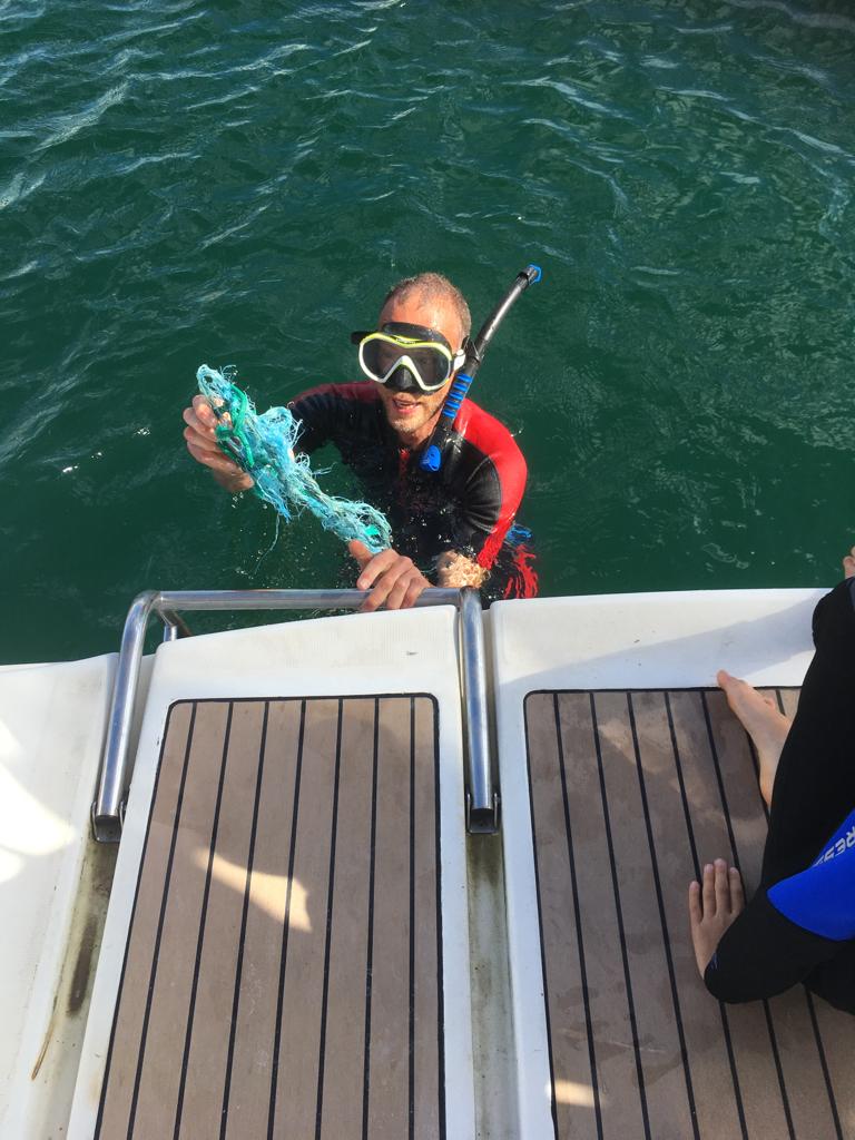 Nous commençons le troisième jour de navigation avec un petit problème technique; Nos batteries se rechargent mal. Pour les recharger, nous comptons d’une part sur les panneaux solaires et d’autre part sur un hydrogénérateur, c’est à dire une sorte d’hélice qui tourne dans l’eau grâce à la vitesse du bateau et actionne une dynamo. C’est clairement l’hydrogénérateur qui produit trop peu de courant par rapport à notre vitesse. Nous craignons d’avoir accroché un cordage ou un morceau de filet de pêche dans l’hélice. J’immerge la GoPro à partir de la plage arrière pour essayer de voir ce qu’il se passe sous le bateau. L’hélice moteur est propre, ce qui est une bonne nouvelle. Nous pouvons utiliser le moteur en cas de besoin. L’hydrogénérateur, quant à lui, semble tourner mais il est impossible d’en dire plus. Nous sommes donc contraints de faire tourner le moteur du bateau durant environ une heure par jour pour recharger nos batteries. Ceux qui nous connaissent bien imaginent à quel point cela nous fait mal… Une petite plongée à l’arrivée à Lanzarote confirmera le diagnostic de filet de pêche coincé dans l’hélice de l’hydro.