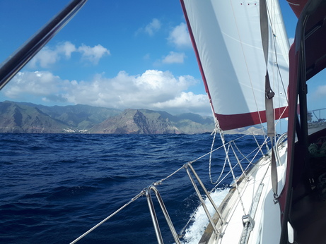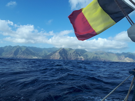 Pour nous rendre à La Palma, nous devons contourner l’île de Tenerife par le nord et puis mettre cap plein ouest en direction du port de Santa Cruz de La Palma. Nous quittons vers midi de façon à arriver à La Palma au lever du jour le lendemain. Nous commençons par tirer des bords dans un vent faible avant d’abattre en grand vers La Palma après avoir débordé la pointe nord de l’île. Le vent s’établit bien en début de nuit et nous progressons rapidement. Conformément aux prévisions, il tombe malheureusement complètement à 10 miles de la côte et nous terminons par deux heures de moteur dans une mer formée. Ce petit désagrément est toutefois vite oublié lorsque nous apercevons les équipages de Tarumba et de Picasso qui se sont levés tôt pour nous accueillir et prendre nos lignes au ponton d’accueil.