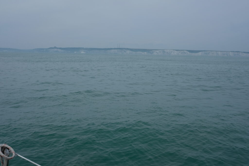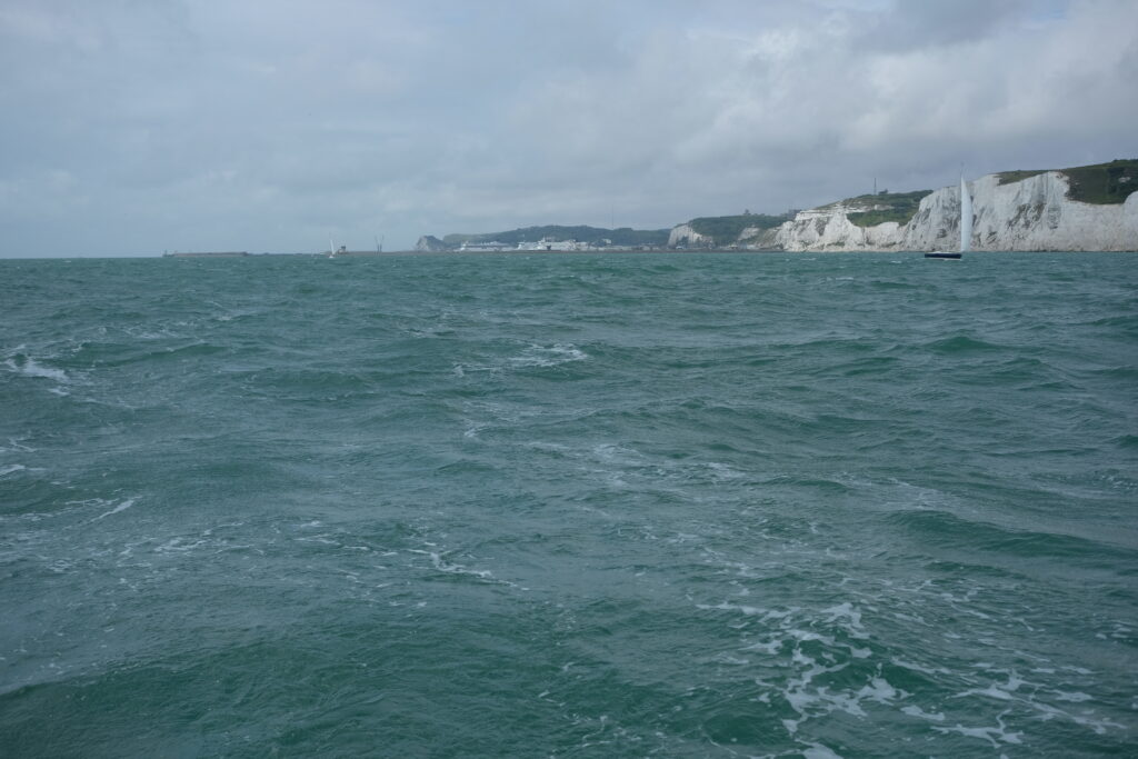 Le 17 Juillet, la météo est clémente et la mer belle. Les conditions semblent donc favorables à une première traversée de la manche. Après quelques calculs de courants, nous nous mettons d’accord sur une heure de départ et une route à suivre. Nous mettons d’abord cap sur la bouée ZC2 en bordure du rail. Arrivée à proximité de cette bouée, le vent tombe complètement. Nous affalons les voiles et c’est donc au moteur que nous effectuerons cette première traversée. Nous suivons un cap perpendiculaire à l’axe du rail et le courant nous amène tranquillement en regard de l’entrée ouest du port de Douvres. L’entrée de Granville Dock s’ouvre juste devant nous et nous prenons notre place sans difficulté. Le fait d’avoir fait d’avoir traversé la manche et de revenir en Angleterre nous rend euphoriques.