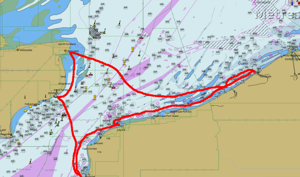 Suite logique de ce voyage, nous mettons cap sur Ramsgate qui sera notre avant-dernière étape avec le retour à Ostende. La météo au départ est un peu plus musclée que dont nous avons l’habitude. Il y a un 20 nœuds de vent SO et une mer d’un bon mètre. C’est donc sous génois 1 ris seul que nous rejoindrons rapidement et sans difficulté le port de Ramsgate. Malheureusement, en arrivant à Ramsgate, nous apprenons que c’est la « Ramsgate Week ». Toutes les places du port sont réservées aux régatiers. Nous devrons donc séjourner au ponton d’accueil où nous passerons deux nuits passablement agitées par l’entrée de la houle dans le port.
